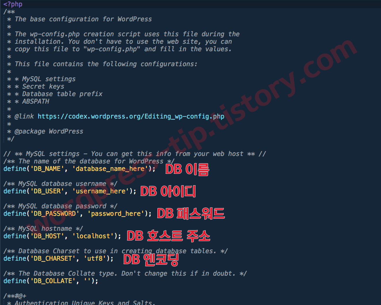 define('DB_NAME','database_name_here'); = DB 이름 입니다. 데이터베이스 내 생성된 DB 이름이 입력되는 영역입니다.