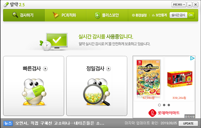설치를 완료하면 자동으로 알약이 바로 실행되며, 실시간 감시가 작동됩니다.