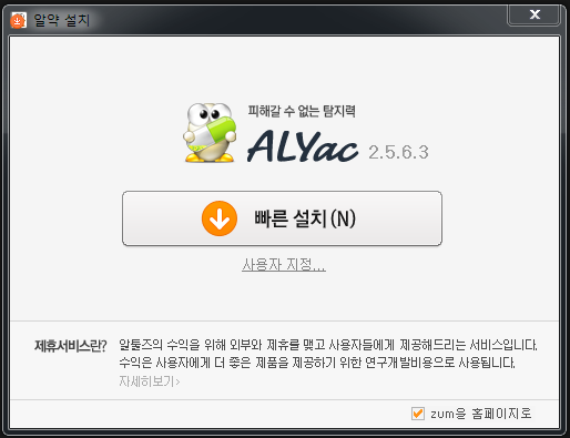 원치 않는 경우에는 하단의 zum을 홈페이지로 체크박스를 해제한 후 빠른설치 버튼을 누르시면 됩니다.