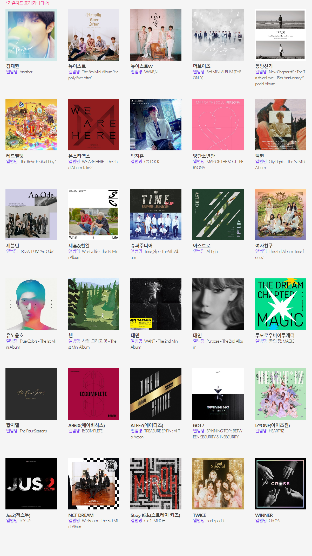 세훈&찬열, 슈퍼주니어, 아스트로, 여자친구, 유노윤호, 첸, 태민, 태연, 투모로우바이투게더, 황치열, 에이비식스,