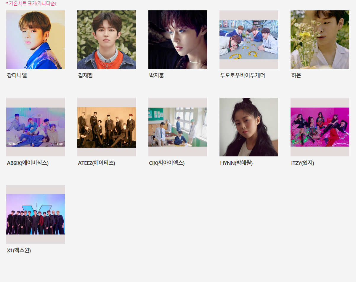 강다니엘, 김재환, 박지훈, 투모로우바이투게더, 하은, 에이비식스, 에이티즈, 씨아이엑스, 박혜원, ITZY, X1
