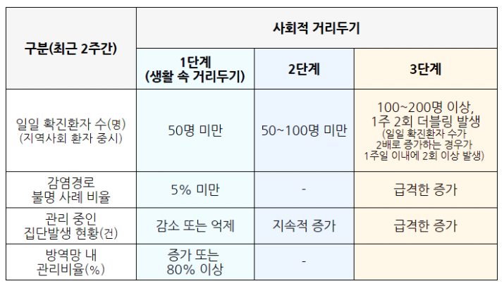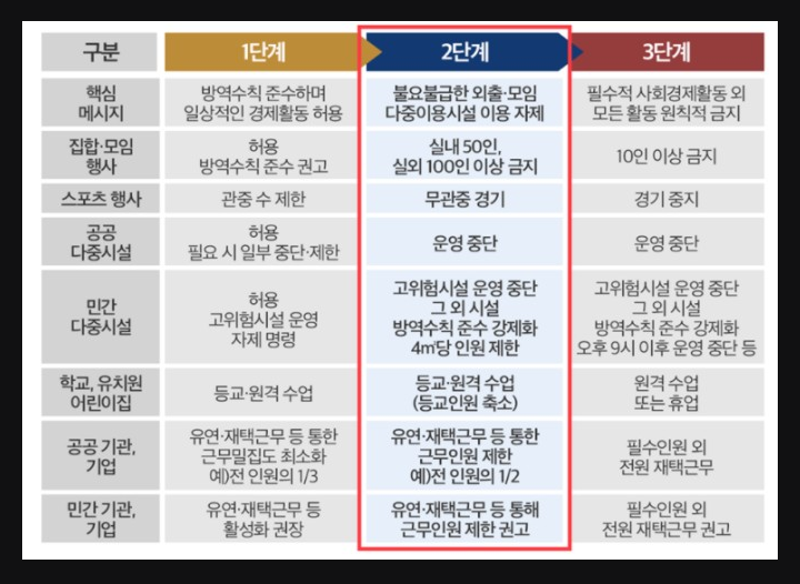최근 몇달간 50명 미만으로 1단계를 시행했으나, 갑작스러운 수도권 집단감염으로 일일 확진환자수가 50~100명 미만 기준치에 도달하여 2단계가 시행되었습니다.